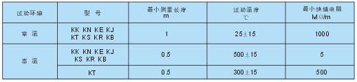 絕緣電阻應(yīng)在偶絲與偶絲之間和偶絲與外套管之間測(cè)量。外直徑≤1.5mm的電纜,所用電壓為75±25Vd.c,外直徑>1.5mm的電纜,所用電壓為500±50Vd.c。室溫每米絕緣電阻和高溫每米絕緣電阻應(yīng)符合表1—4的規(guī)定。